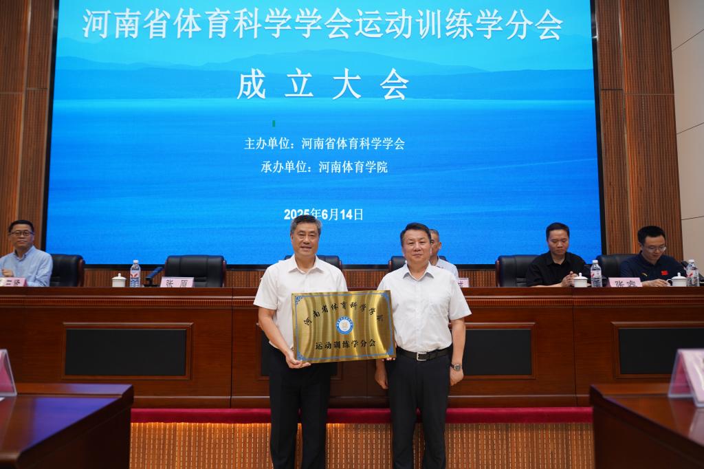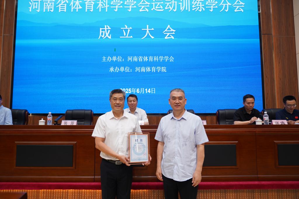 会上宣读了《河南省体育科学学会运动训练学分会主任委员、副主任委员、秘书长、常委、委员等人员名单》;李激扬代表学会向我校授予分会牌匾,毛玉成向分会首任主任委员张原颁发聘书。