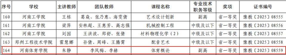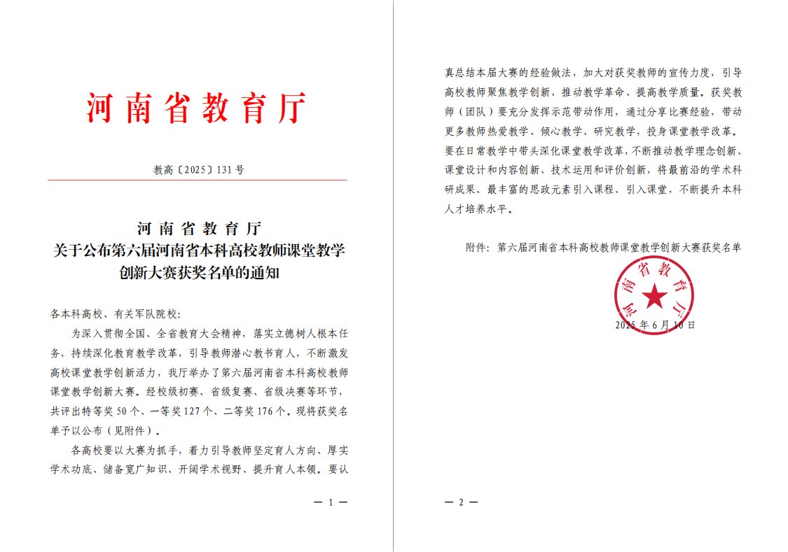 近日,河南省教育厅公布了第六届河南省本科高校教师课堂教学创新大赛的获奖名单,我校教师在比赛中表现突出,荣获佳绩。朱静老师荣获省级一等奖,邓峰、杨慧、杨芊夏三位老师荣获省级二等奖。这一成绩充分展示了我校在教育教学创新方面的卓越成就以及教师团队深厚的教学功底。