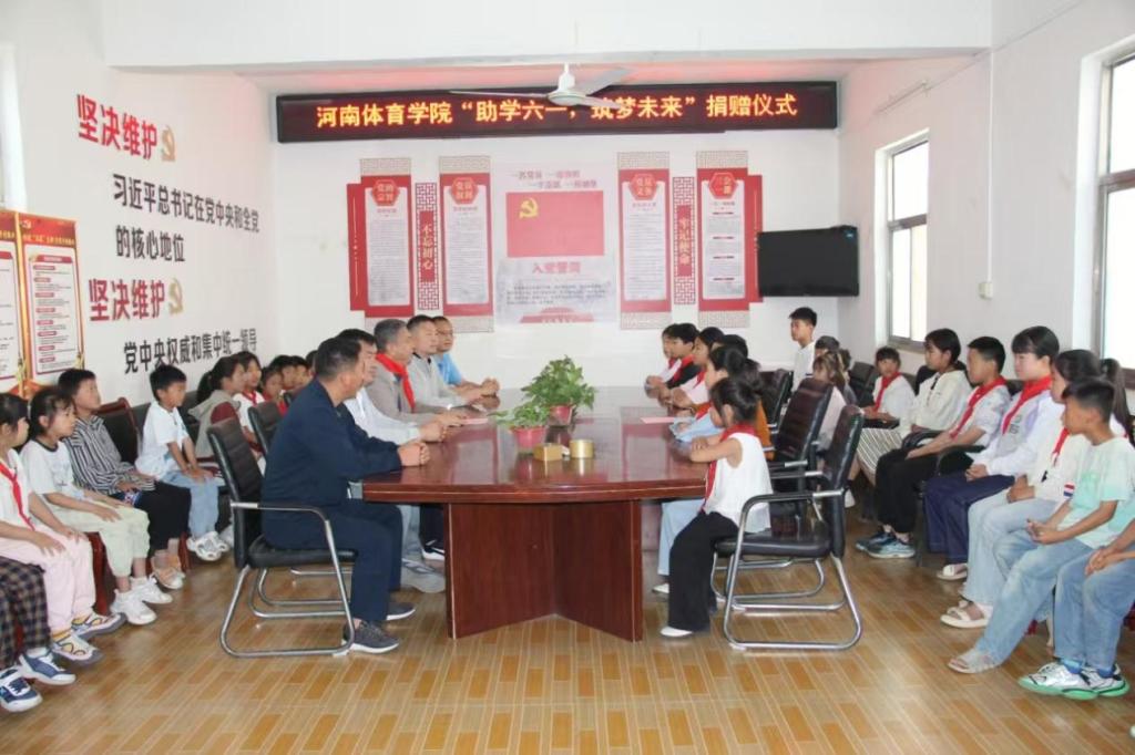 为庆祝“六一”国际儿童节、关心关爱乡村留守儿童,5月24日,河南体育学院在温县赵堡镇西马村开展“助学六一,筑梦未来”公益活动,为全村113名小学生捐赠了价值近2万元的书包、文具等学习用品。校领导刘丹宁出席活动,听取驻村工作队工作汇报并调研乡村振兴等工作。河南体育学院驻村第一书记孟强参加活动并陪同调研。