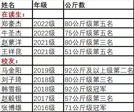 此外,运动训练专业2017级校友赵毅锟夺得57公斤级第三名,运动训练专业2021级学生赵蒙洋、2018级校友刘子琦夺得80公斤级第三名。在51公斤级、75公斤级、80公斤级较量中,运动训练专业2021级在读生王祥昆、2022级在读生牛圣杰、2022级在读生郑豪杰分别夺得第五名。