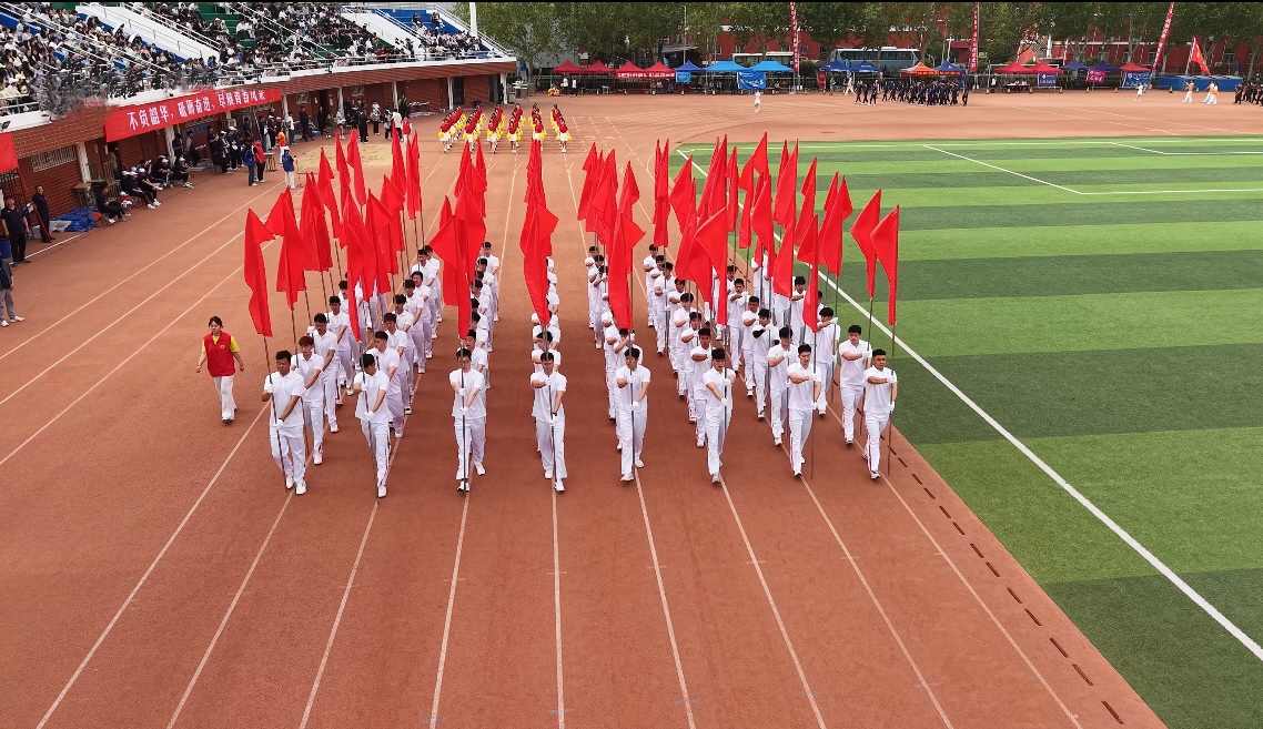 上午830分,伴随着恢弘嘹亮的《运动员进行曲》,以国旗护卫队为先导,校旗队、刀旗队、花束队、裁判员、运动员机器人代表队,以及各系、登封校区组成的方队依次通过主席台接受检阅。方队各出新意、各展风采,师生们用精心创意的表演和嘹亮的口号表达了对这场体育盛会的期待与热爱。方队入场后,全体师生奏唱《中华人民共和国国歌》,气氛庄重而肃穆。运动员代表和裁判员代表庄严宣誓,承诺严格遵守竞赛规则和赛场纪律,严格践行公平竞争的精神,全力以赴,赛出风格,赛出水平。
