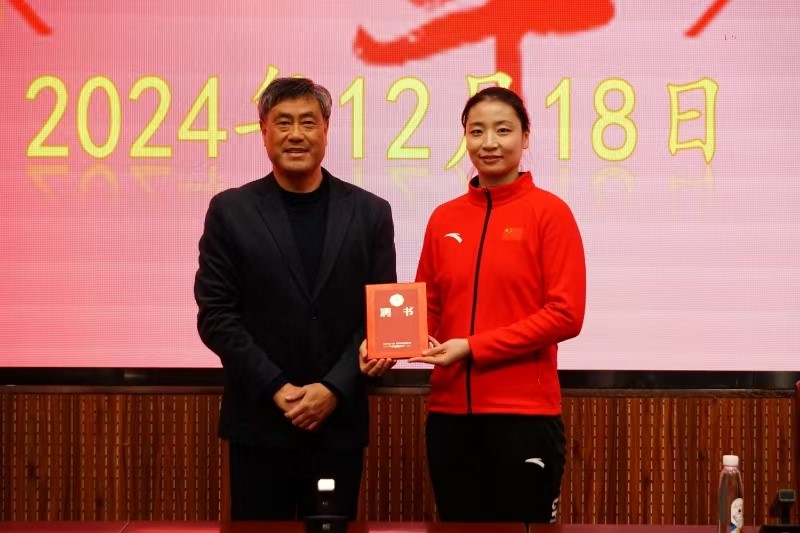 校领导张原出席报告会,为尹笑言颁发了河南体育学院冠军讲堂主讲人聘书。
