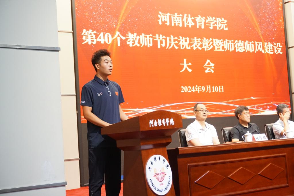 校领导张绍通讲话。他首先代表学校党委向全校教职员工、离退休老同志以及奋斗在教育战线的体院校友致以节日问候和美好祝愿。他指出,面对当前社会经济态势和学院发展现状,全体教职工要居安思危,提高自身素养,树立创新意识,转变发展思路,保持“赶考”的清醒和奋进的姿态,学校要以改革发展为动力,持续完善治理体系,提升管理能力,努力在校园基础设施建设、人才评价机制、薪酬体系、学科及课程建设等方面,为广大教师提供一流的服务保障,不断实现河南体育学院事业高质量跨越式发展。他强调,全校教师要按照习近平总书记提出的“四有”教师标准,以人民教育家为榜样,大力弘扬教育家精神,努力成为教书育人的大先生,为学生点亮理想的灯、照亮前行的路,为体育河南建设、体育强国、教育强国建设贡献智慧和力量。