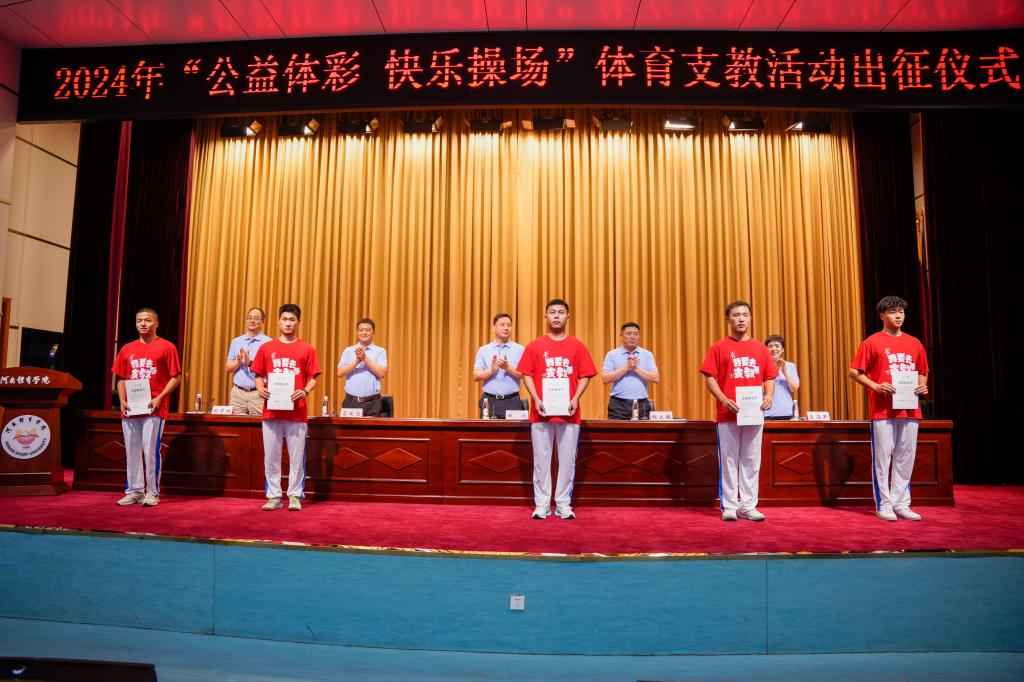 出征仪式上,河南省体育彩票管理中心向体育教育系团队颁发了支教牌匾,全体嘉宾为志愿者颁发了支教证书。