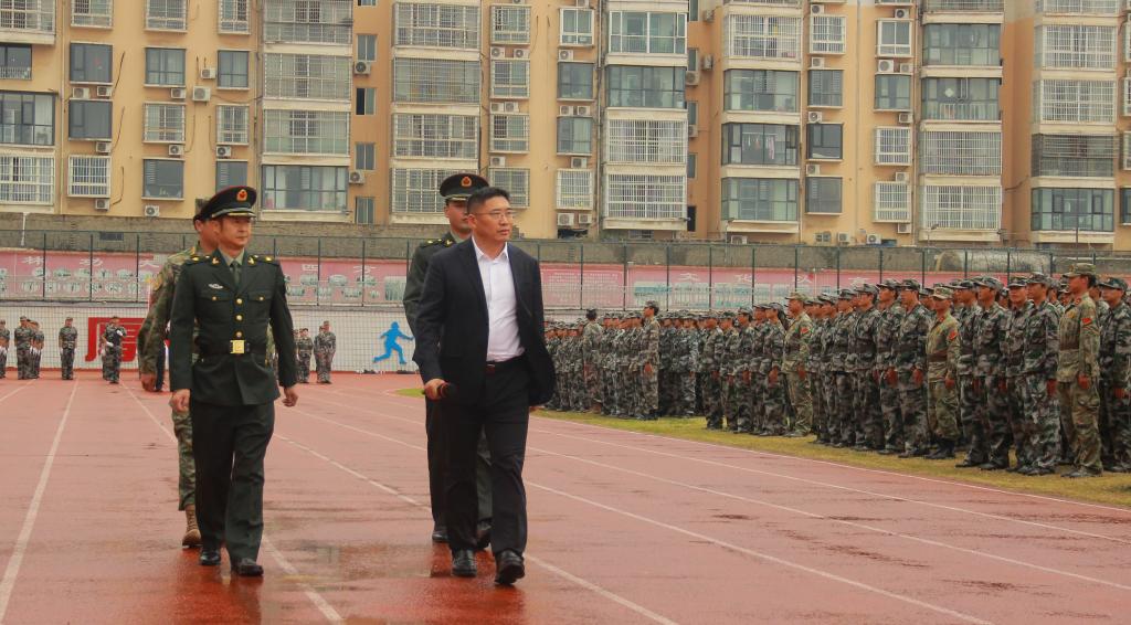 张大超在军训教官的陪同下,依次检阅新生方队。新生们身着迷彩、身姿挺拔,以昂扬的军姿、嘹亮的口号和饱满的精神状态,充分展现出我校学子朝气蓬勃、积极向上的青春风貌,赢得现场阵阵掌声。