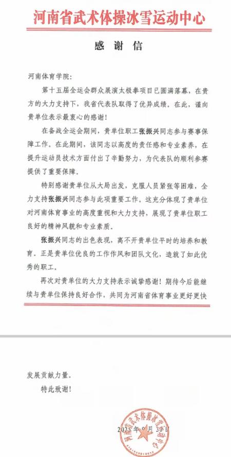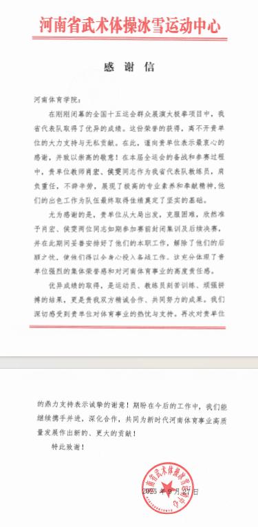 近日,我校收到来自河南省武术体操冰雪运动中心的两封感谢信,信中对我校教师肖宏、侯雯、张振兴在备战第十五届全国运动会期间的关键贡献予以高度赞扬。