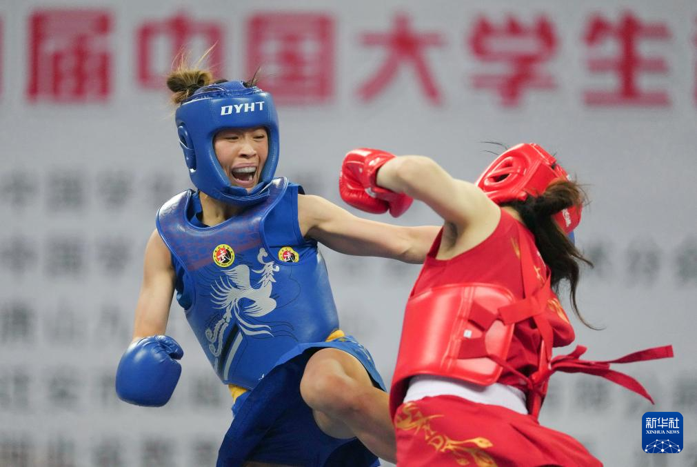 河南体育学院散打队选手臧佳慧(左)和北京体育大学武术散打队选手柳婉婷在女子丁组52公斤级比赛中