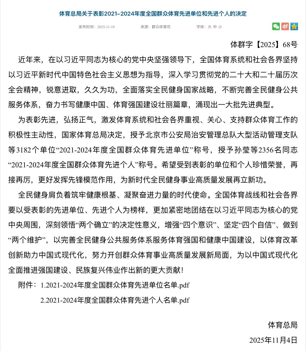 11月10日,全国群众体育先进单位先进个人、全国体育系统先进集体先进个人表彰大会在广州隆重召开。河南体育学院团委凭借扎实的工作成效与突出的行业贡献,荣获“2021-2024年度全国群众体育先进单位”称号;我校教师孟欢欢、朱德雨凭借在群众体育领域的深耕实践与卓越成就,同步斩获“2021-2024年度全国群众体育先进个人”称号。集体与个人荣誉的双重收获,既是国家对学校体育育人工作的高度认可,更是对全体河南体院人深耕体育事业、践行全民健身战略的莫大鼓舞。全国群众体育先进单位及先进个人评选表彰由人力资源和社会保障部、国家体育总局联合开展,每四年举办一次,是群众体育领域的权威荣誉,彰显了国家对体育强国建设的坚定推进。此次河南体育学院集体与个人同时获奖,充分印证了学校在群众体育人才培养、体育事业推动、社会服务等方面的综合实力与显著成效,为学校高质量发展写下浓墨重彩的一笔。