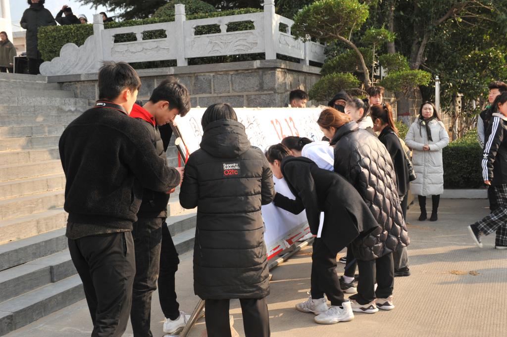 校区全体师生现场宣誓:我们铭记,血雨腥风、民族屈辱;我们奋斗,立志复兴、敢于担当;我们许诺,发奋图强、圆梦中华!最后,全体师生共同签名,缅怀历史,展望未来。