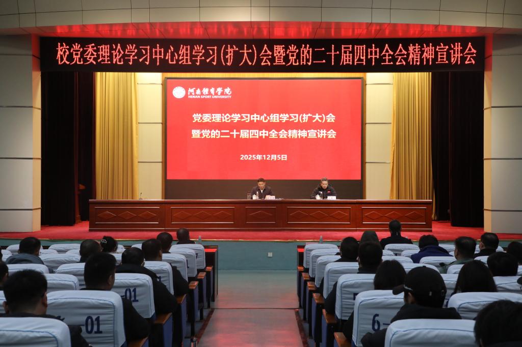 12月5日上午,河南体育学院党委理论学习中心组学习(扩大)会暨党的二十届四中全会精神宣讲会在学术报告厅举行,校领导张大超为师生作专题宣讲。张大超要求,全校师生要以党的二十届四中全会精神为指引,锚定教育强国、体育强国、健康中国战略目标,立足体育学院特色,发扬体育人“使命在肩、奋斗有我”的精神,锐意进取,真抓实干,为以中国式现代化全面推进强国建设、民族复兴伟业贡献磅礴的体育力量。