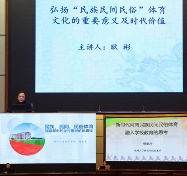 研讨会上,我院武术与民族传统体育专业耿彬教授、侯胜川教授、樊丽沙博士、杨应威副教授等围绕弘扬“民族民间民俗”体育文化的重要意义及时代价值、新时代河南民族民间民俗体育融入学校教育的思考等主题进行了专题报告,共寻、共商、共谋民族民间民俗体育文化的渊源之根、传承之策、振兴之路,为民族民间民俗体育的高质量发展献计献策。