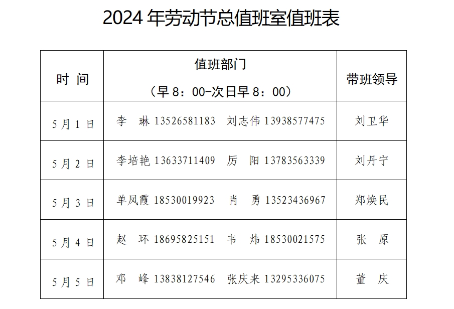 附件: 2024 年劳动节总值班室值班表