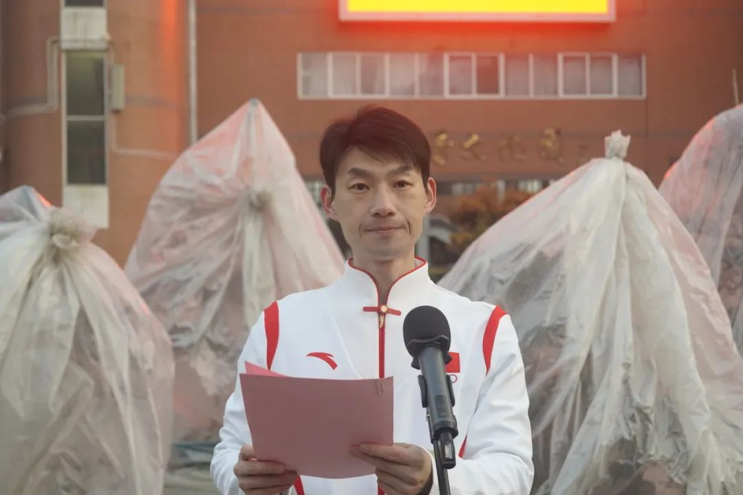 河南体育学院教师代表马建超发表演讲,他分享自身从农村小伙到世界冠军的成长经历,讲述母校在其成长路上给予的支持与帮助。他结合校训“厚德博学 拼搏创新”,从训练馆、综合楼、掌心茧子、教学楼等角度,阐述校训在日常学习、训练、科研等场景中的体现。他鼓励师生传承中原武魂,突破极限,为中国体育事业贡献力量,并引用习近平总书记寄语,号召全体体院人以校训为指引,努力在世界体育史上留下浓墨重彩的中国印记。