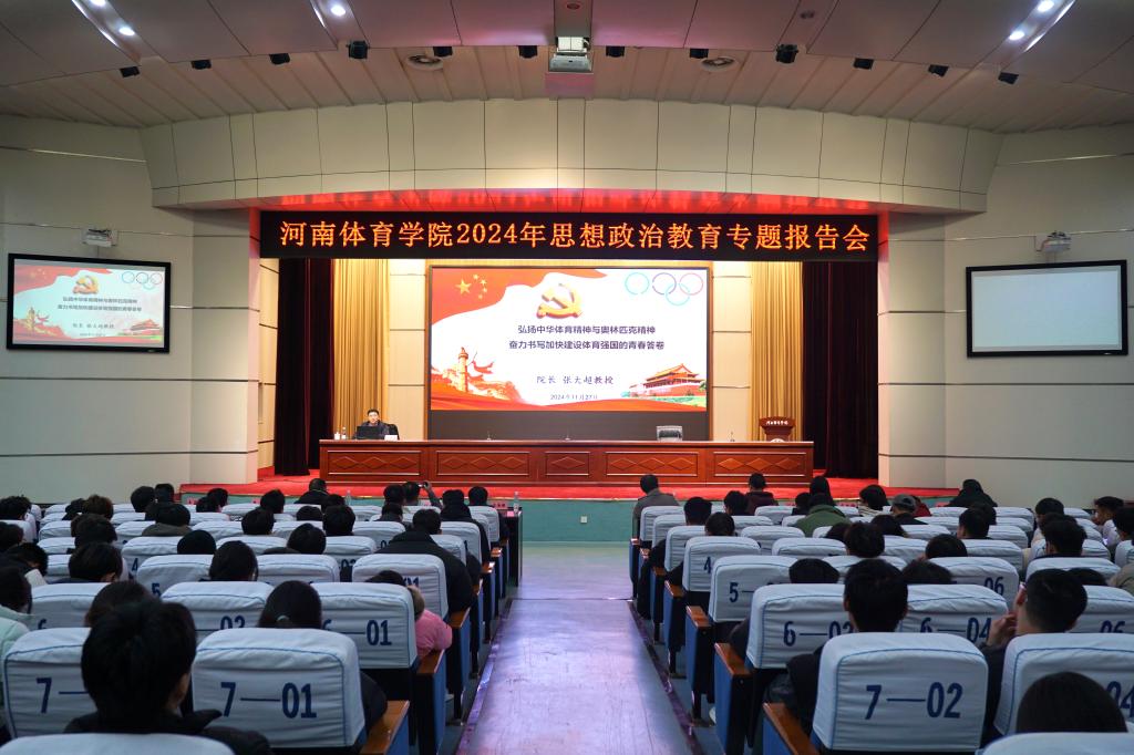 为深入学习贯彻党的二十大及二十届二中、三中全会精神,11月27日晚,学校在学术报告厅举办思想政治教育专题报告会,校领导张大超以《弘扬中华体育精神与奥林匹克精神,奋力书写加快建设体育强国的青春答卷》为题,向在校500余名师生作专题宣讲。