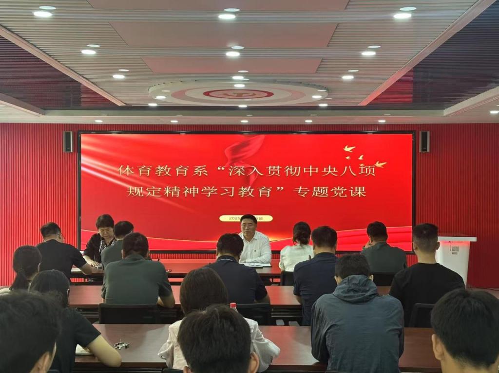 为深入贯彻中央八项规定精神学习教育,加强党风廉政建设,以优良作风赋能学校高质量发展6月26日中午,体育教育系在图文信息楼704会议室开展“深入贯彻中央八项规定精神学习教育”专题党课,校领导张大超为体育教育系全体师生党员授课。