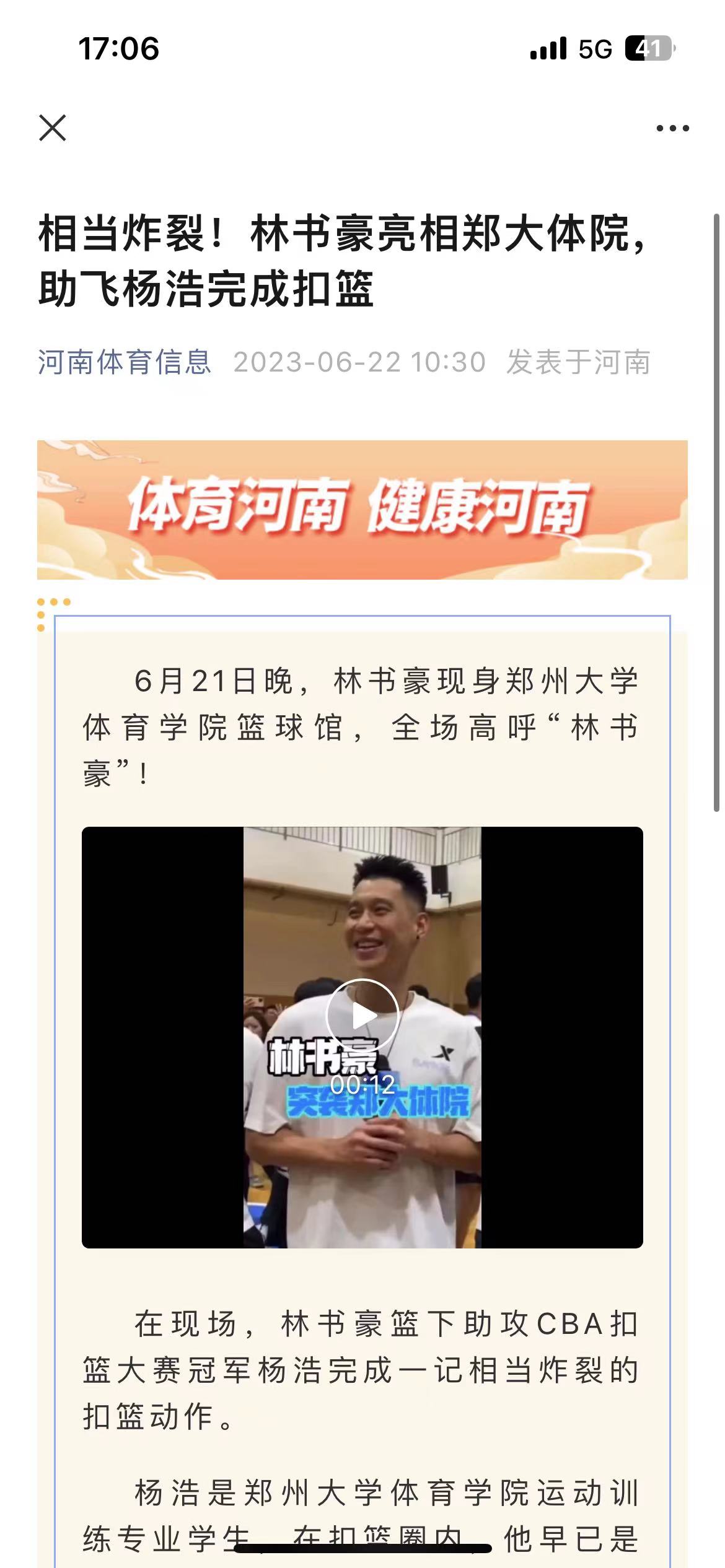 2023年6月22日河南体育信息公众号发布:相当炸裂!林书豪亮相郑大体院,助飞杨浩完成扣篮