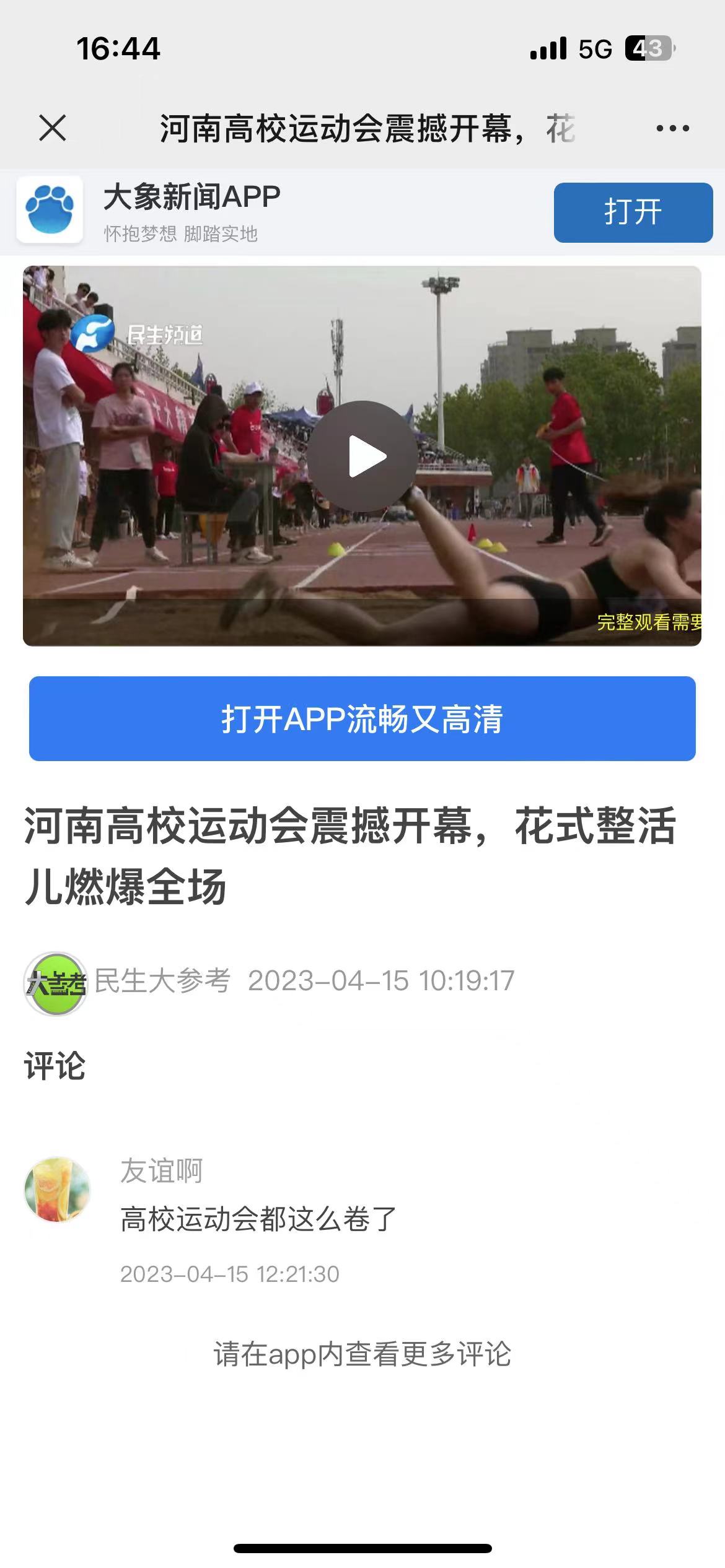 2023年4月15日大象新闻发布:河南高校运动会震撼开幕,花式整活儿燃爆全场