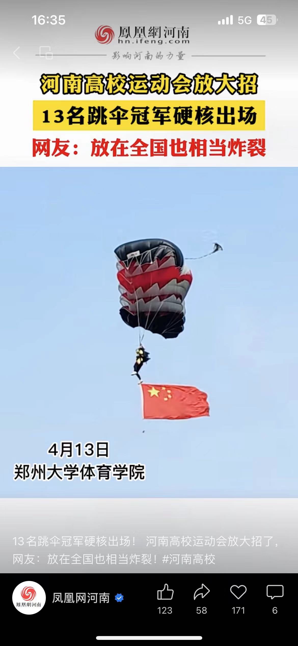 凤凰网河南∶13名跳伞冠军硬核出场! 河南高校运动会放大招了,网友:放在全国也相当炸裂!