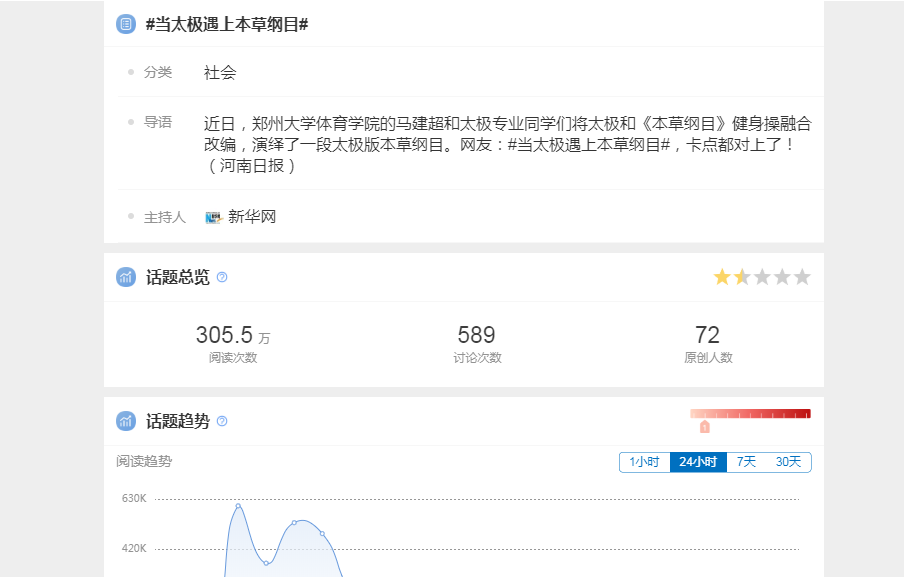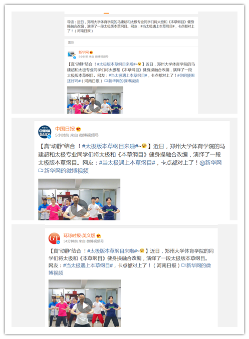 5月4日,郑州大学体育学院进入疫情防控“静态管理”,我院教师马建超在校封控期间将太极和《本草纲目》健身操融合改编,与太极拳队员们演绎了一段太极版本草纲目。学院新闻中心与河南日报新媒体进行策划在第一时间对其进行了宣传报道,在经过网络传播与发酵后形成热点,被新华网、中国日报、环球时报、中国教育电视台、2021成都世界大学生运动会组委会等40余家主流媒体的官方微博、自媒体账号转载,平均点击量超30万,其中新华网官官方微博的相关推送在短短的几个小时点击量内达到300万+,一时间“太极本草纲目来啦”这个微博话题冲上热搜,且网络热度还在不断攀升。郑州大学体育学院再次出圈成为网络顶流!