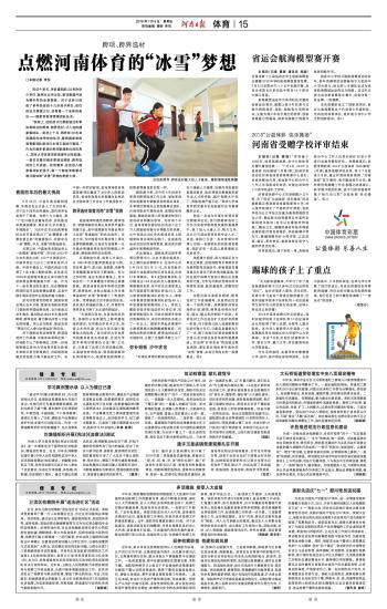 76日,河南日报第十五版对我院冬季项目跨界选材工作进行了长篇幅报道,记者对院党委书记张绍通,郑大体院冬季项目管理办公室(筹)负责人进行了采访。文章以“四年后的最大挑战”、“跨界选材培育河南‘冰雪’良驹”、“弥补短板沙中求金”三个部分作为切入点,对我院自接受省体育局下达的冬季项目责任管理任务后,克服院冬管办(筹)工作人员不足、基础设施薄弱等客观条件,发挥主观能动性,在短短两个多月的时间就完成了七万人的基础体能与专项能力的自测,遴选出600余名备选名单,上报国家体育总局相关部门的实际情况进行了详细报道。报道引用国家冬季运动管理中心滑雪部部长韩晓鹏的话:河南的冰雪项目跨项、跨界选材走到了世界前列,占据了全国的半壁江山!