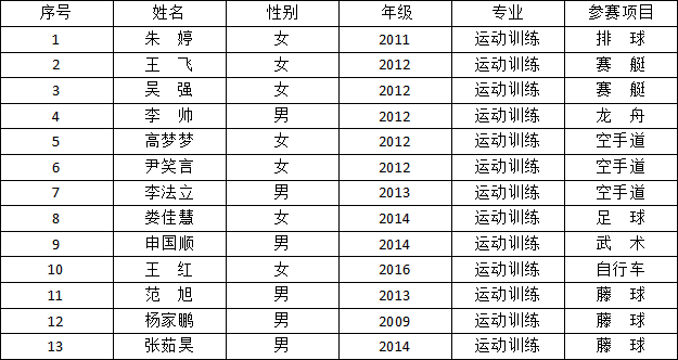 2018年7月25日,中国国家体育总局在官网对即将参加2018年雅加达亚运会中国代表团人员名单进行了公布。我院教师任峰在本届亚运会中担任藤球项目的裁判员工作。学院共有13名校友和在籍生身披国家队战袍为国出征。他们是: